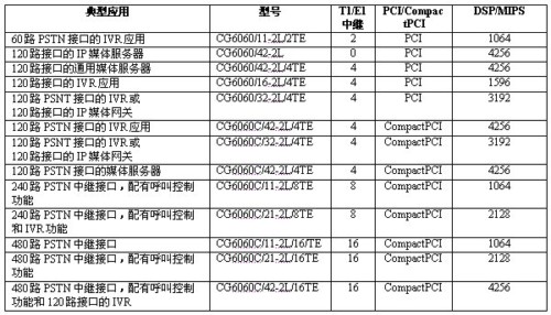 Call ControlTM(NCC)。CG 6060 PCI板卡和CG 6060C CompactPCI板卡是研制經(jīng)濟(jì)型應(yīng)用系統(tǒng)的理想選擇,可研制的應(yīng)用系統(tǒng)類型包括:媒體服務(wù)器、增強(qiáng)服務(wù)平臺(tái)、IVR、會(huì)議應(yīng)用、消息處理、IP集中交換解決方案等。