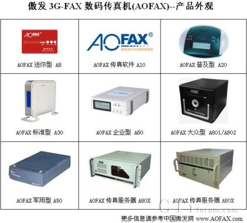 由金恒科技推出的全系列數(shù)碼傳真產(chǎn)品涵蓋了上述三個種類,上圖就是AOFAX無紙傳真產(chǎn)品系列的外形圖。其中迷你型A8和傳真軟件A10屬于第一種,普及型A20、標(biāo)準(zhǔn)型A30、軍用型A50和企業(yè)型A60屬于第二種,大眾型A801/A802和專業(yè)型傳真服務(wù)器則屬于第三種。