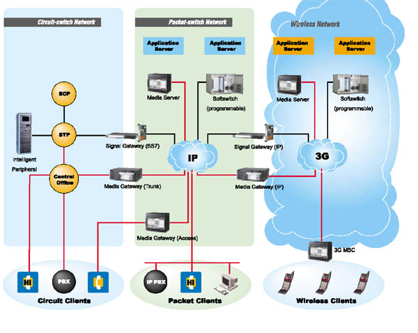 在下一帶網(wǎng)絡(NGN)中媒體網(wǎng)關在軟交換(softswitch)的控制下,將一種網(wǎng)絡中的媒體轉換成另一種網(wǎng)絡所要求的媒體格式。如媒體網(wǎng)關能夠在電路交換網(wǎng)的承載通道和分組網(wǎng)的媒體流之間進行轉換,可以處理音頻、視頻或T.120,也具備處理這三者任意組合的能力,并且能夠進行全雙工的媒體翻譯,可以演示視頻/音頻消息,實現(xiàn)其他IVR功能,同時還可以進行媒體會議等。