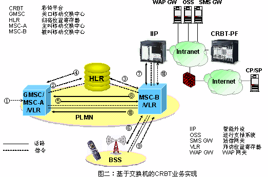 智能網(wǎng)方案對現(xiàn)有的網(wǎng)絡(luò)改動較小,可以快速開展彩鈴業(yè)務(wù)。但是,在現(xiàn)有的智能網(wǎng)網(wǎng)絡(luò)條件下,該方案會造成話路迂回,占用過多的中繼資源;而且整個呼叫過程中都要占用CRBT-IP,容易造成話務(wù)負載過大,限制了CRBT業(yè)務(wù)的用戶數(shù)量。