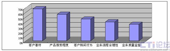 那么保險企業(yè)希望通過進一步深入開展電話中心信息化工作得到哪些效用或者有價值的信息呢,我們認為,電話中心為保險企業(yè)所提供的信息中最重要的依然是“客戶的聲音”,具體來說,包括客戶喜好和客戶購買行為等,其次便是業(yè)務(wù)流程信息。企業(yè)管理層對來自電話中心的不同信息的關(guān)注程度如下圖所示。