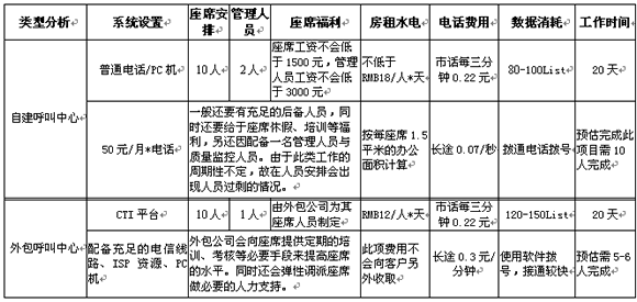 以上是以Telemarkering項目舉例,如需完成一萬條數(shù)據(jù)的外呼工作,自建呼叫中心與外包型呼叫中心的區(qū)別。以上數(shù)字只是提現(xiàn)在設(shè)備、人員效率等方面問題,另定期的人員培訓(xùn)及相關(guān)系統(tǒng)的維護(hù)將是費(fèi)用產(chǎn)生的一大因素。其實在項目的實施過程中發(fā)生的費(fèi)用只是一部分,從公司的運(yùn)營角度看是可以節(jié)省很大的精力(例如:人員招聘、培訓(xùn)、福利待遇)及運(yùn)營時間。