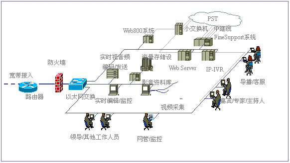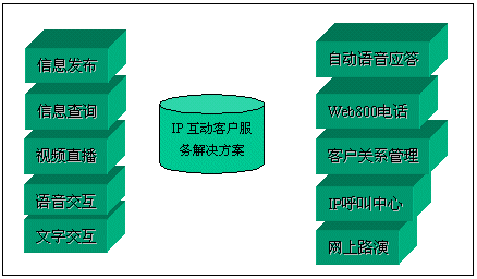 經(jīng)過對比分析,我們發(fā)現(xiàn),目前國際國內市場上很多客戶服務產(chǎn)品,大都僅僅完成客戶服務的一部分。北極星“IP互動客戶服務中心解決方案”則引入互動客戶服務(ICS:Interactive Customer Service)系統(tǒng)以及數(shù)碼互動直播的概念,形成了由視頻點播、網(wǎng)上路演、語音和文字交互、IP客戶服務中心、Web800語音電話、實時服務中心、專家實時在線、客戶關系管理、在線尋呼系統(tǒng)和客戶社區(qū)服務系統(tǒng)等全方位的服務內容。該方案主要基于IP架構,系統(tǒng)擴展性非常靈活,系統(tǒng)體現(xiàn)的客戶服務思想非常能夠滿足我們的需求。2001年3月,經(jīng)過一段時間的試運行后,我們正式推出了這套“IP互動客戶服務”系統(tǒng)。