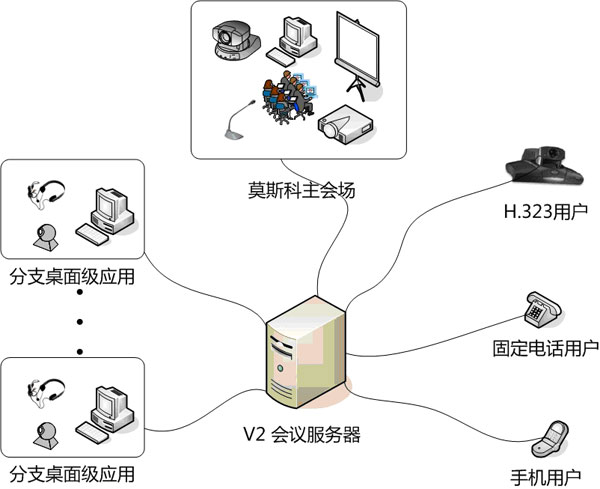 俄羅斯百事可樂(lè)公司莫斯科總部和俄羅斯其它各地分支機(jī)構(gòu)通過(guò)公眾互聯(lián)網(wǎng)連接,以V2視頻會(huì)議系統(tǒng)為紐帶,將不同的參會(huì)用戶(hù)連接在一起,實(shí)現(xiàn)即時(shí)的音視頻溝通及數(shù)據(jù)協(xié)作。不僅是普通的PC機(jī)用戶(hù),包括傳統(tǒng)H.323用戶(hù),手機(jī)和固定電話(huà)用戶(hù)等都可以加入V2視頻會(huì)議。