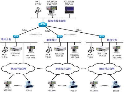 在株洲、邵陽和永州市行采用級聯(lián)的方式來實現(xiàn)。具體實現(xiàn)方式為: 寶利通新型視頻會議終端VSX 7000E則和地市行的寶利通多點控制單元(MCU)MGC-25通訊,并且MGC-25負(fù)責(zé)其縣支行終端的接入,同時用MGC-50和MGC-25的端口級聯(lián),采用這種連接方式就可以實現(xiàn)從省行-地市行-縣支行的三級網(wǎng)視頻會議的召開。