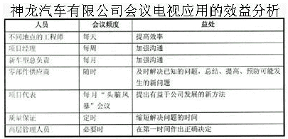 下表通過對(duì)神龍汽車有限公司應(yīng)用會(huì)議電視系統(tǒng)的分析,展示了會(huì)議電視虛擬應(yīng)用所帶來的益處。