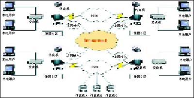 3.系統(tǒng)內(nèi)用戶發(fā)送傳真說明:集團(tuán)A區(qū)的用戶如果發(fā)送本地傳真,則在集團(tuán)A區(qū)的e-FAX網(wǎng)絡(luò)傳真機(jī)收到任務(wù)請求后,通過本地的PSTN網(wǎng)絡(luò)發(fā)送傳真,傳真發(fā)送成功后,系統(tǒng)自動給發(fā)送人一份傳真通報,發(fā)送完成;集團(tuán)A區(qū)的用戶如果發(fā)送外地傳真,例如發(fā)送到集團(tuán)D區(qū),集團(tuán)A區(qū)的e-FAX網(wǎng)絡(luò)傳真機(jī)會自動根據(jù)收到的任務(wù)請求信息進(jìn)行判斷,根據(jù)判斷的信息,將發(fā)送傳真請求和相應(yīng)的傳真文件通過Internet路由到集團(tuán)D區(qū)的e-FAX網(wǎng)絡(luò)傳真機(jī),集團(tuán)D區(qū)的網(wǎng)絡(luò)傳真機(jī)收到訊息后,會自動通過本地的PSTN發(fā)送傳真任務(wù),發(fā)送結(jié)果會自動通報到集團(tuán)A區(qū)的發(fā)送人,發(fā)送完成。同理,在集團(tuán)的其他區(qū)域內(nèi)的發(fā)送傳真請求都會自動路由,判斷發(fā)送方式,從而完成發(fā)送任務(wù)。