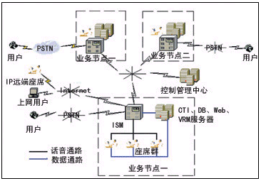 包括遠(yuǎn)端坐席和近端坐席,完成業(yè)務(wù)的受理,為用戶提供所需服務(wù)。近端座席通常與ISM采用一般話路方式連接。根據(jù)座席情況,遠(yuǎn)端座席可以通過多種方式來實現(xiàn)。其中最靈活的方式是通過Internet接入呼叫中心平臺的IP遠(yuǎn)端座席。