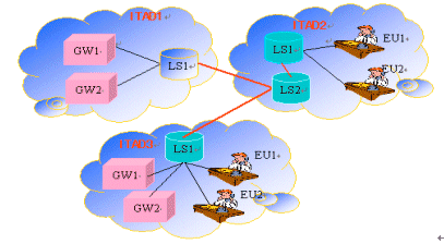 管理域就成了一個虛擬的IP電話網(wǎng)關(guān)提供者了,因為它提供了網(wǎng)關(guān)服務(wù),但是它自己實際又沒有網(wǎng)關(guān)和管理任何網(wǎng)關(guān)。一個IT管理域也可以沒有端用戶,這時它可以提供"批發(fā)"網(wǎng)關(guān)的服務(wù),為其他ITAD里的顧客提供網(wǎng)關(guān)服務(wù);一個IT管理域可以既沒有網(wǎng)關(guān)也沒有端用戶,只有LS,在這種情況下,ITAD充當(dāng)一個批發(fā)商(Reseller),獲取其它域的網(wǎng)關(guān)信息,而且收集和傳播這些信息對其它有用戶的ITAD。