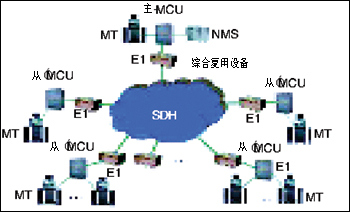 多點(diǎn)視頻會(huì)議系統(tǒng)主要由視聽多媒體會(huì)議終端MT、通信傳輸網(wǎng)絡(luò)SDH、網(wǎng)絡(luò)節(jié)點(diǎn)的多點(diǎn)控制單元MCU、網(wǎng)絡(luò)管理系統(tǒng)NMS以及外圍設(shè)備等幾部分組成。由于通信網(wǎng)絡(luò)不同,會(huì)議電視系統(tǒng)的終端和多點(diǎn)控制單元MCU也不盡相同。例如,對(duì)于采用電路交換通信網(wǎng)絡(luò)的多點(diǎn)會(huì)議系統(tǒng)通過MCU實(shí)現(xiàn),而包交換通信網(wǎng)絡(luò)則通過多點(diǎn)會(huì)議服務(wù)器來實(shí)現(xiàn)多方會(huì)議。如圖:
