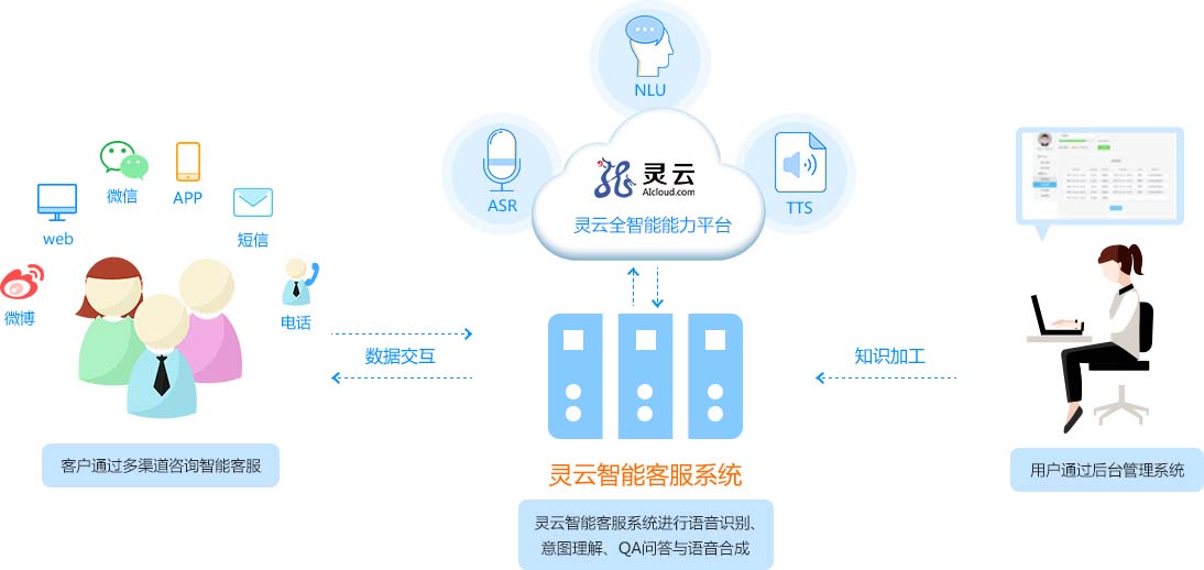 客戶通過電話、微信、網(wǎng)頁(yè)等多種渠道咨詢智能客服,靈云全智能客服系統(tǒng)進(jìn)行語音識(shí)別、意圖理解、QA問答與語音合成,企業(yè)通過后臺(tái)管理智能客服系統(tǒng)。