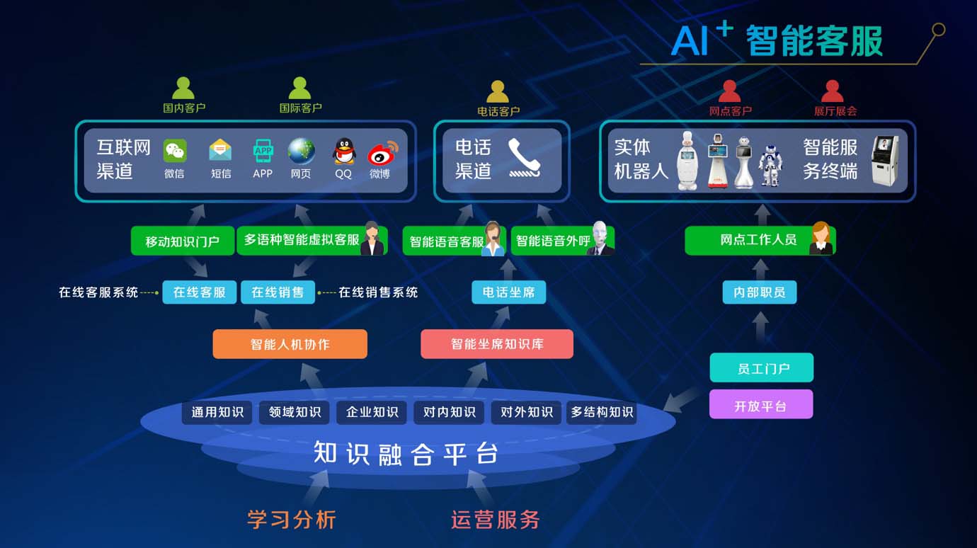 多種渠道融合:覆蓋網(wǎng)頁(yè)、微信、短信、APP、實(shí)體機(jī)器人等多種客服渠道,通過文本、語音、圖像等不同展現(xiàn)方式,充分利用互聯(lián)網(wǎng)和移動(dòng)設(shè)備,與用戶之間進(jìn)行溝通交互