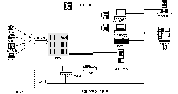 銀行客戶撥入銀行客戶服務(wù)中心系統(tǒng)后,首先聽到歡迎詞“歡迎進入客戶服務(wù)中心系統(tǒng),按1對公查詢,按2儲蓄查詢,按3信用卡查詢,按4金融信息查詢,按5人工服務(wù)”,如果客戶選擇語音、傳真自動服務(wù),則進入IVR系統(tǒng),客戶可以按照語音提示進行選擇,獲得相應(yīng)自動服務(wù),如果用戶選擇人工服務(wù),則進入人工服務(wù)系統(tǒng),由銀行業(yè)務(wù)人員提供相應(yīng)人工服務(wù)。如果用戶使用金融圖文電話或終端進入銀行客戶服務(wù)中心,則系統(tǒng)自動轉(zhuǎn)到IVR系統(tǒng)中的MODEM,提供相應(yīng)遠(yuǎn)程查詢服務(wù)。