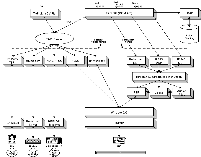 微軟的TAPI3.0集成了傳統(tǒng)電話的媒體流控制功能。另外,將原來(lái)的TAPI2.1發(fā)展為COM組件模式,允許TAPI應(yīng)用程序以任何一種語(yǔ)言來(lái)寫(xiě),如C/C++或微軟的VB。