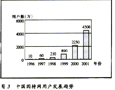 據(jù)CNNIC統(tǒng)計(jì)的數(shù)據(jù)表明,到2000年12月31日止,中國(guó)的因特網(wǎng)用戶(hù)達(dá)到2250萬(wàn)戶(hù),上網(wǎng)計(jì)算機(jī)892萬(wàn)臺(tái),預(yù)計(jì)2001年中國(guó)將有超過(guò)4500萬(wàn)的網(wǎng)民。中國(guó)域名總數(shù)為12.2萬(wàn)個(gè),WWW站點(diǎn)數(shù)26.54萬(wàn)個(gè)。中國(guó)因特網(wǎng)的發(fā)展速度驚人,與國(guó)際因特網(wǎng)的發(fā)展速度相當(dāng)。中國(guó)因特網(wǎng)用戶(hù)發(fā)展趨勢(shì)見(jiàn)圖3。