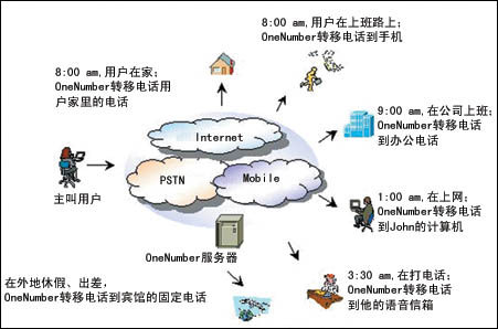 通過(guò)OneNumber這一業(yè)務(wù)系統(tǒng),電信運(yùn)營(yíng)商可以整合用戶的各種號(hào)碼資源,有效留住客戶;用戶只需申請(qǐng)一個(gè)OneNumber號(hào)碼,無(wú)論用戶走到哪里,主叫用戶都可以通過(guò)電話、手機(jī)、PC等方式撥打該號(hào)碼聯(lián)系到用戶。用戶接受信息的手段可以根據(jù)自己的設(shè)定,以電話、手機(jī)、短信、PC等方式與主叫用戶建立聯(lián)系,也可以語(yǔ)音信箱的方式收聽(tīng)留言。