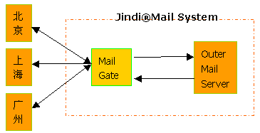 如果選用Jindi MailServer作為外部郵件服務(wù)器,可以在同一臺(tái)外部郵件服務(wù)器上配置可選的MailGate模塊,該模塊可以將指定域用戶的郵件進(jìn)行定向投遞,而不依賴DNS的配置。內(nèi)部郵件通過(guò)內(nèi)部DNS在郵件網(wǎng)關(guān)處進(jìn)行存儲(chǔ)轉(zhuǎn)發(fā)到外部。