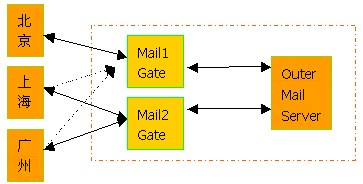 1.正常工作時(shí)北京的內(nèi)部郵件服務(wù)器通過(guò)Mail1 Gate與外部郵件服務(wù)器通訊,上海、廣州通過(guò) Mail2 Gate與外部郵件服務(wù)器通訊;