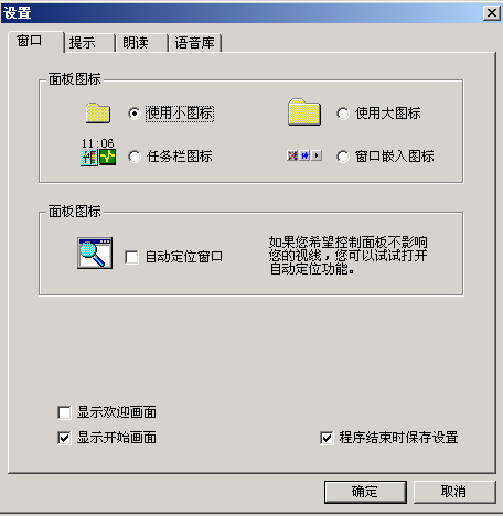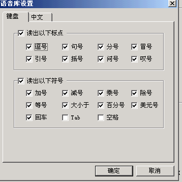 如果需要進(jìn)一步的調(diào)整,可以選擇菜單里的“設(shè)置……”。打開設(shè)置窗口(如圖3)。窗口共分四個(gè)選項(xiàng),每個(gè)選項(xiàng)里除了剛介紹的幾種常用功能調(diào)整外,還可以控制歡迎畫面、開始畫面、設(shè)定存儲(chǔ)等功能,規(guī)定提示速度、朗讀速度的快慢,選擇提示方式,設(shè)定提示報(bào)警條件。在“語音庫(kù)”選項(xiàng)中還可以選擇朗讀為男聲還是女聲。單擊“設(shè)置”按鈕,可以根據(jù)具體需要選擇“鍵盤”或“中文”里被朗讀標(biāo)點(diǎn)符號(hào)的種類(如圖4)。