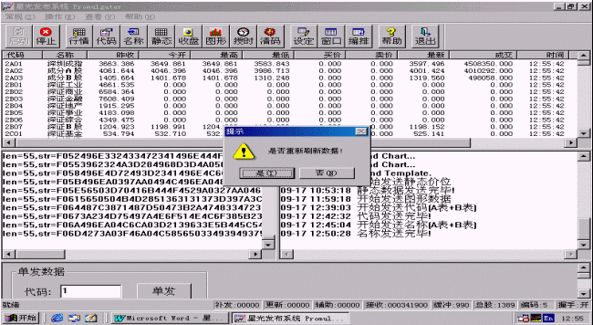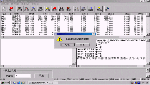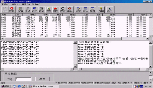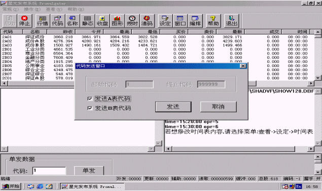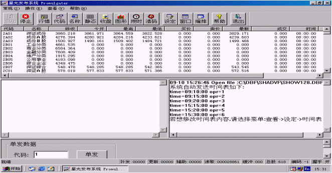 行情也可以單發(fā),只要在進行證券信息發(fā)布時在程序主界面的下方<單發(fā)數(shù)據>區(qū)輸入要單發(fā)的股票代碼,然后點擊<單發(fā)>按鈕,系統(tǒng)就會盡快刷新該只股票。