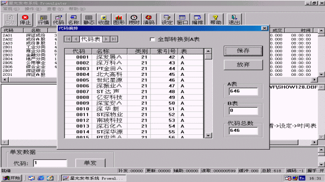 代碼編排是指用戶根據證券數(shù)據記錄在數(shù)據庫中的位置重新排定股票的索引位置,索引次序可不同于證券代碼的次序,也不是數(shù)據庫中記錄的次序,用戶可根據需要自己設定,將來發(fā)布信息時就按此索引次序(索引號)所指向的股票信息位置取信息進行發(fā)布。
