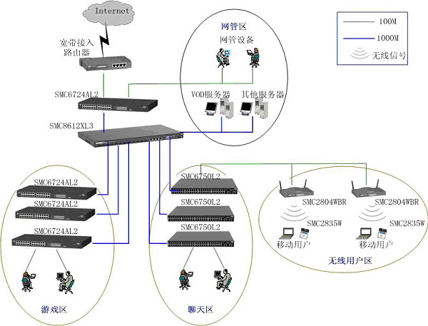 本方案采用"千兆光纖干線,百兆交換到桌面"的設(shè)計(jì)思路,各骨干線路均為1000M。骨干網(wǎng)通過高速線路接入INTERNET,網(wǎng)吧內(nèi)實(shí)現(xiàn)主干千兆交換、百兆到點(diǎn),整個(gè)網(wǎng)吧內(nèi)實(shí)現(xiàn)無阻塞通信。根據(jù)顧客的不同消費(fèi)需求,將網(wǎng)吧分為了網(wǎng)絡(luò)游戲區(qū)、聊天區(qū)、貴賓區(qū)等,根據(jù)不同區(qū)域的特點(diǎn),細(xì)化了不同網(wǎng)絡(luò)的解決方案。方案中采用的核心設(shè)備和二層設(shè)備都支持802.1Q標(biāo)準(zhǔn)VLAN和IGMP組播協(xié)議,為VOD、多媒體娛樂等豐富應(yīng)用的開展打下了堅(jiān)實(shí)的基礎(chǔ) 。通過劃分VLAN,MAC地址綁定來劃分了不同類型用戶,很好地滿足網(wǎng)吧的各項(xiàng)業(yè)務(wù)應(yīng)用需求。此外,SMC的豐富無線網(wǎng)絡(luò)產(chǎn)品可以很靈活的滿足網(wǎng)吧的組網(wǎng)需求,投資少、施工快。在提供高性能的同時(shí),還保證很好的安全性,既支持基于802.11b標(biāo)準(zhǔn)的安全機(jī)制,又支持動(dòng)態(tài)安全鏈路,以及基于802.1x的增強(qiáng)性安全或認(rèn)證功能。