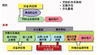 軟交換已經(jīng)從一種單純的技術(shù)發(fā)展成為網(wǎng)絡(luò)演進(jìn)中的一種理念,這種理念的一個(gè)核心就是更加開放。而傳統(tǒng)運(yùn)營商由垂直化的網(wǎng)絡(luò)、業(yè)務(wù)一體化對用戶“絕對控制”狀態(tài)走向開放化、平臺化管理的多業(yè)務(wù)單元共同參與的價(jià)值鏈最終方向,的確需要長期的過程。并且,這種發(fā)展過程的決定因素將不取決于技術(shù)發(fā)展的成熟與否,而是鏈條中各成員的生存狀態(tài)與利益分配。正如文中提到的,隨著網(wǎng)絡(luò)和應(yīng)用的不斷發(fā)展,業(yè)務(wù)與網(wǎng)絡(luò)的關(guān)系、運(yùn)營商和業(yè)務(wù)經(jīng)營者的角色都將發(fā)生改變。