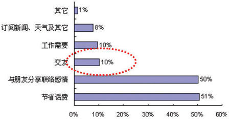 首先從使用目的看,我們的調(diào)查研究表明,大部分用戶使用短信最主要的目的是節(jié)省話費(fèi),該類用戶比例高達(dá)51%; 其次是與朋友分享,以及聯(lián)絡(luò)感情,比例為50%; 而其他如交友、工作需要、訂閱新聞、天氣及其他等所占比例較低,均不超過10%。由此可見,雖然短信業(yè)務(wù)已經(jīng)深入地滲透了用戶的生活,但是用戶的主要應(yīng)用仍然是點(diǎn)對點(diǎn)的應(yīng)用,信息類的應(yīng)用只占很小的部分(見圖2)。