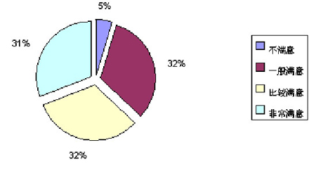 對于短信業(yè)務(wù)的使用情況,僅有31%的用戶認(rèn)為非常滿意,認(rèn)為比較滿意的用戶比較多,其比例占樣本總量的32%。認(rèn)為一般滿意和不滿意的用戶比例分別是32%和5%(見圖3)。