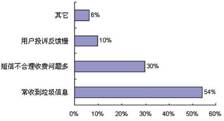 調(diào)研結(jié)果顯示,用戶對目前經(jīng)常收到垃圾信息表示不滿比例高達(dá)54%;其次是短信費(fèi)用問題,用戶的不滿意見也比較多,例如短信的訂閱與退訂,對于一些短信費(fèi)用的不合理收取、一些訂閱業(yè)務(wù)無法取消等等,該比例為30%;另外有10%左右的用戶對解決投訴的及時(shí)性和有效性表示了不滿。