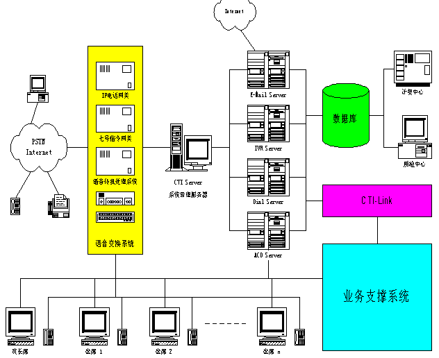 所述的電子郵件服務(wù)器(7)、交互式語音管理服務(wù)器(8)、撥號(hào)服務(wù)器(9)以及用于平均分配話務(wù)的語音系統(tǒng)分配服務(wù)器(10)均位于所述系統(tǒng)管理服務(wù)器(6)與數(shù)據(jù)庫(12)之間。所述的四個(gè)服務(wù)器(7~10)通過一個(gè)CTI業(yè)務(wù)接口(15)與業(yè)務(wù)支撐系統(tǒng)(16)連接。