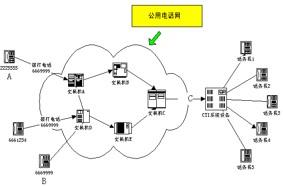 使用該方法,用戶根據(jù)需要將電話轉(zhuǎn)移到CTI系統(tǒng),完全解決了傳統(tǒng)CTI系統(tǒng)采用專用特服號(hào)碼服務(wù)所帶來的弊端,其充分利用了傳統(tǒng)電話交換機(jī)原有的功能,實(shí)現(xiàn)了使用用戶的普通電話號(hào)碼完全站在用戶立場的24小時(shí)分布式客戶服務(wù),能夠?yàn)橛脩籼峁┱Z音、傳真、數(shù)據(jù)及人工服務(wù)等接續(xù)服務(wù)。