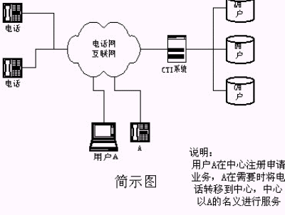 該業(yè)務(wù)方法涉及一種用戶電話轉(zhuǎn)移到CTI(Computer Telephony Integration)語音服務(wù)系統(tǒng)的接續(xù)服務(wù)方法,其CTI系統(tǒng)通過接口連接于公用電話網(wǎng),用戶在CTI系統(tǒng)登記,選擇服務(wù)功能,相關(guān)信息存入數(shù)據(jù)庫,用戶電話設(shè)置轉(zhuǎn)移;當(dāng)客戶呼叫已轉(zhuǎn)移用戶電話時(shí),自動(dòng)接入CTI語音系統(tǒng),請求相關(guān)信息,對(duì)信息進(jìn)行分析判斷、處理,查詢數(shù)據(jù)庫用戶信息,以用戶名義進(jìn)行接續(xù)服務(wù)。其完全避免了傳統(tǒng)CTI系統(tǒng)的專用特服號(hào)碼服務(wù)的弊端,充分利用了交換機(jī)的功能,以用戶的電話號(hào)碼為客戶提供語音、傳真、數(shù)據(jù)及人工接續(xù)服務(wù)。