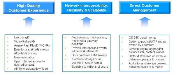 Refresh®和AnswerFast Plus® (MONA的一部分),同時(shí)多媒體網(wǎng)關(guān)解決方案也包括在內(nèi)。其它方面的可互操作性和用戶(hù)體驗(yàn)改善問(wèn)題很容易能解決,對(duì)今天現(xiàn)有的WAP服務(wù)是一種補(bǔ)充。