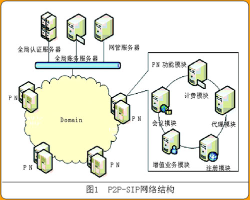 PN在地理上散布各處,邏輯上根據(jù)選用的P2P機(jī)制的不同可以是環(huán)形的(Chord協(xié)議)、矩陣的(CAN協(xié)議)、網(wǎng)狀的(Pastry協(xié)議和Tapestry協(xié)議);镜腜N至少包括注冊(cè)和代理兩種功能。為進(jìn)行商業(yè)運(yùn)營(yíng),可以部署全局認(rèn)證服務(wù)器、全局賬務(wù)服務(wù)器和網(wǎng)管服務(wù)器等等,用于管理全部的用戶和所有的PN。