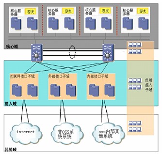 OSS管理者在保證及時準(zhǔn)確的提供信息服務(wù)的基礎(chǔ)上,應(yīng)該按不同的安全級別研究對安全域進(jìn)行劃分,確認(rèn)那些為核心子域,那些為接入域,那些為其他域。通過對不同的安全域進(jìn)行不同的安全策略劃分,保證如上的安全域所享受的安全級別是不同的。圖1顯示,核心域、接入域和其他域是第次接入的,向下訪問可以透明傳輸,而向上的訪問就必須設(shè)定相應(yīng)的訪問控制。