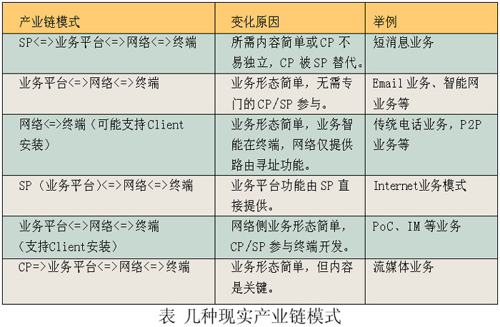 CP=> SP< =>業(yè)務(wù)平臺(tái)< =>網(wǎng)絡(luò)< =>終端,而現(xiàn)實(shí)中的產(chǎn)業(yè)鏈模式可以通過該模式變化得到,如下表所示。