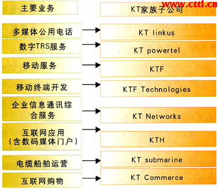 目前,KT集團是全業(yè)務(wù)運營商,同時也是韓國最大的固網(wǎng)運營商,它在FMC領(lǐng)域最大動作就是BcN寬帶融合網(wǎng)絡(luò),這是韓國政府為確保韓國在IT和電信技術(shù)市場持續(xù)領(lǐng)先地位而實行的IT839計劃的核心環(huán)節(jié)之一。BcN目的是要將有線與無線系統(tǒng)、通信和廣播系統(tǒng)融合在一起,為企業(yè)用戶和個人用戶提供一個共同的渠道收發(fā)語音、文本、圖像和視頻文件。為此,KT集團順著新的價值鏈,對集團內(nèi)部分機構(gòu)的功能進行了調(diào)整,其主要組織架構(gòu)如圖2所示:
