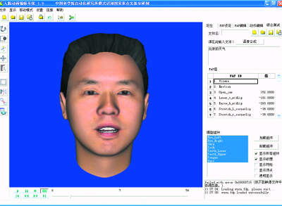說(shuō)話人頭像模塊包括語(yǔ)音合成、人臉動(dòng)畫(huà)兩個(gè)子模塊。語(yǔ)音合成模塊是為了將天氣查詢(xún)獲得信息表達(dá)出來(lái)。本文中,語(yǔ)音合成模塊是基于中科院自動(dòng)化所設(shè)計(jì)的“繪聲”語(yǔ)音合成系統(tǒng),該系統(tǒng)能夠?qū)⑷我廨斎氲奈谋荆赃B續(xù)自然的聲音朗讀出來(lái),并能夠處理中文普通話、粵語(yǔ)、英語(yǔ)等多種語(yǔ)言或方言。