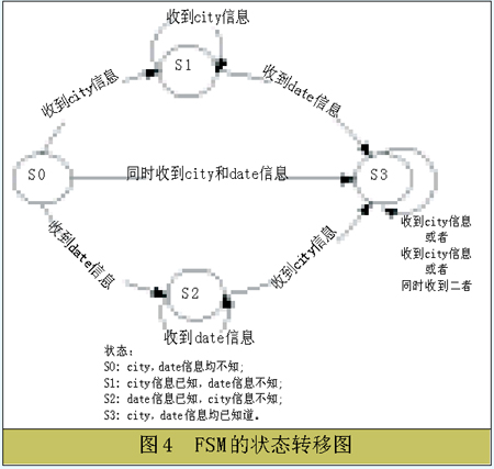在總結(jié)了前人工作經(jīng)驗(yàn)和結(jié)合本系統(tǒng)的實(shí)際問(wèn)題的基礎(chǔ)上,我們?cè)趯?duì)話管理的具體實(shí)現(xiàn)上,將框架理論和有限狀態(tài)自動(dòng)機(jī)理論相結(jié)合,完成了一個(gè)智能的對(duì)話管理模塊。我們先將對(duì)話管理限制在天氣查詢(xún)領(lǐng)域。在系統(tǒng)中,通過(guò)人機(jī)之間的對(duì)話和確認(rèn),系統(tǒng)需要得到要查詢(xún)的時(shí)間和地點(diǎn)信息之后反饋查詢(xún)結(jié)果。