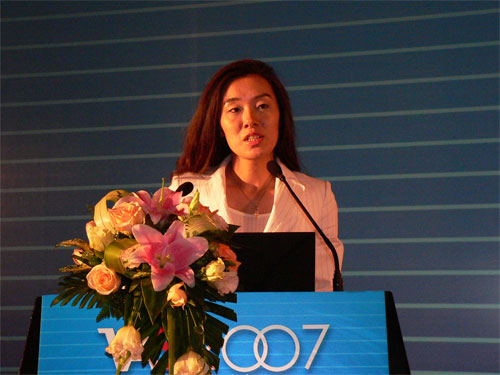 圖為NTTDoComo北京事務(wù)所對(duì)外業(yè)務(wù)高級(jí)經(jīng)理陳文雅作題為“日本3G應(yīng)用、運(yùn)營與挑戰(zhàn)”的演講。