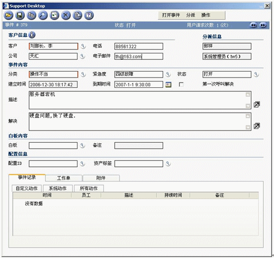 事件記錄應(yīng)該在某個(gè)服務(wù)臺(tái)工具中記錄和跟蹤,該工具最好是作為集成的服務(wù)管理工具集的構(gòu)成部分。該工具應(yīng)該在引發(fā)新的事件時(shí)提供最基本的事件記錄。比如為了幫助提高效率,當(dāng)你在天匯幫助臺(tái)的用于記錄事件的事件窗口中輸入請(qǐng)求發(fā)起者的姓名時(shí),利用客戶(hù)數(shù)據(jù)庫(kù)可以自動(dòng)填充諸如位置、部門(mén)和聯(lián)系詳細(xì)信息等字段。天匯幫助臺(tái)還支持使用計(jì)算機(jī)電話(huà)集成