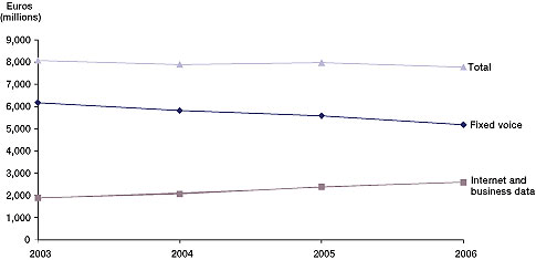 但問題是,在發(fā)達國家,用戶寬帶接入市場已經(jīng)接近飽和。正因為是這樣一種情況,所以用戶數(shù)量也就很難再有增加。ARPU值在極大的競爭壓力下也很難有很大的突破。一切都靜止不動,固話收入持續(xù)下降,所以圖中的“'Internet and business data”部分的收益增長幅度也在逐漸縮小。從圖中的業(yè)務(wù)走勢線可以看出,總收益也從開始的8百萬歐元下降到了6百萬歐元。