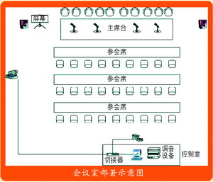 中大型會(huì)議室約在150~250平米,一般為教室型布局,即主要人員和領(lǐng)導(dǎo)在主席臺(tái)就座,參會(huì)人員在臺(tái)下就坐,這種情況的布局和設(shè)備放置的情況如圖所示。