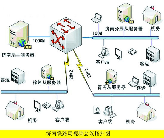 由于路局改革后組織結(jié)構(gòu)的特點,決定了跨地域會議較多,如濟南和徐州、青島之間召開的部門級別的會議比較頻繁,加上三地之間的帶寬制約,本方案采用了主從服務器的系統(tǒng)架構(gòu),1主3從,主服務器設(shè)置在路局網(wǎng)絡(luò)中心,原來濟南分局位置設(shè)置1臺從服務器,負責濟南地區(qū)的內(nèi)部會議,以及與其他2地的遠程會議,同樣徐州、青島也各設(shè)置1臺從服務器。