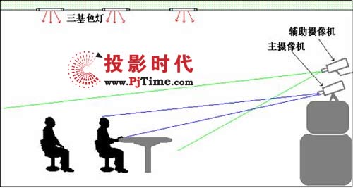 建議大型會議室至少配置2臺攝像機,在會場的前后部各放一臺,安裝方式可采用吊掛天棚、吊掛在墻上等。