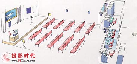 實例三:采用吊掛的投影機、電動投影幕布、功放音響系統(tǒng)