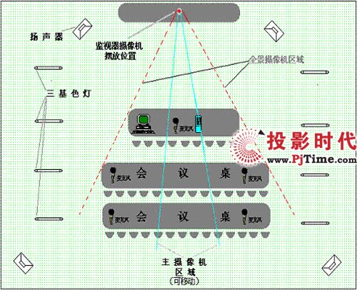 攝像機放置的最佳位置應(yīng)與監(jiān)視器的位置基本相同,揚聲器的位置可放置在會議室的四角,實際中常常是掛在四周的墻上。