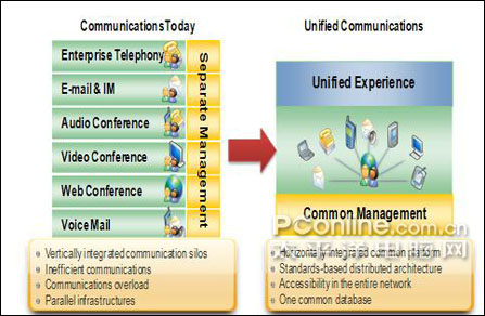 作為PC操作系統(tǒng)和辦公軟件市場上的霸主,微軟對統(tǒng)一通信這塊超級大蛋糕虎視眈眈。早在2006年,微軟就宣布與北電合作進(jìn)軍“統(tǒng)一通信”。微軟將Unified Communications定義為“統(tǒng)一溝通”。官方詮釋:微軟統(tǒng)一溝通技術(shù)將電子郵件、即時消息、語音、音頻、視頻和 Web 會議等諸多技術(shù)融入到了一個單一的直觀系統(tǒng)中,這是一個以人為本的系統(tǒng),技術(shù)只是輔助手段。而且它完全內(nèi)置于業(yè)界熟知和信任的 Microsoft Office system 中。公司們可以使用能夠充分利用其現(xiàn)有數(shù)據(jù)和電信基礎(chǔ)結(jié)構(gòu)的單一統(tǒng)一溝通平臺來取代相沖突的各種不同系統(tǒng)。IT 部門可以用簡化管理和降低總擁有成本的精簡基礎(chǔ)結(jié)構(gòu)交付更靈活、更安全的溝通。