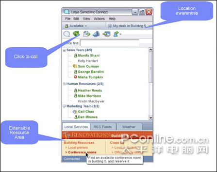 Lotus Sametime Advanced還將擁有多項高級協(xié)作特性(如持久聊天),可支持用戶將關(guān)于特定話題的持續(xù)討論與相關(guān)人群聯(lián)系在一起。Lotus Sametime Advanced的即時共享功能使用戶能夠啟動屏幕或應(yīng)用分享會話,并支持其他參與者“驅(qū)動”并修改文檔。此外,用戶還能夠事先安排同事的位置,突出顯示用戶位置和離線聯(lián)系人上次出現(xiàn)的位置,節(jié)約時間和精力。